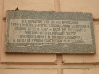 Keywords: Theater by Kotliarevskij.JPG uk а те ито ії інституту знаходився будинок в якому діяв Полтавський п офесійний теат очолюваний Котля евським own Tuma26 Commemorative plaques in Poltava Poltava State Agrarian Academy