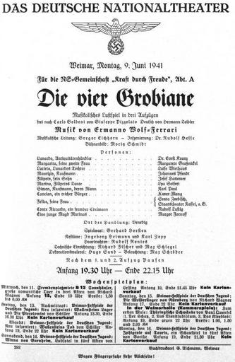 | Keywords: Theaterzettel die Vier Grobiane, Aufführung Deutsches Nationaltheater 1941.jpg de DAS DEUTSCHE NATIONALTHEATER / Weimar Montag 9 Juni 1941 / Die vier Grobiane / Musikalisches Lustspiel in drei Aufzügen / frei nach Carlo Goldoni von Guiseppe Pizzolato Deutsch von Hermann Teibler / Musik von Ermanno Wolf Ferrari / Musikalische Leitung Gregor Eichhorn - Inszenierung Dr Rudolf Hesse 1941 Theaterzettel unbekannt Dt Nationaltheater other versions PD-old-70-1923 I quattro rusteghi | ||||