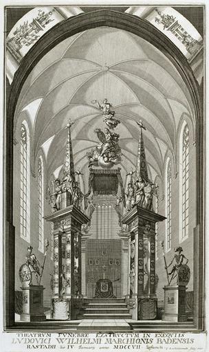 | Keywords: Theatrum Funebre Ludovici Wilhelmi 1707.jpg de Kenotaph des Markgrafen Ludwig Wilhelm von Baden-Baden in Rastatt en Cenotaph of Louis William Margrave of Baden-Baden in Rastatt Theatrum Funebre extrsuctum in exequiis Ludovici Wilhelmi Marchionis Badensis Rastadii the 4 Jaunary anno MDCCVII http //www landesarchiv-bw de/sixcms/media php/120/44945/3a jpg 1707 Author PD-old-100 1707 History of Rastatt Louis William Margrave of Baden-Baden Castrum doloris | ||||