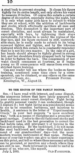 | Keywords: TheFamilyDoctorAug31 1889page10.png 10 a steel busk to prevent stooping It clasps his figure tightly for its entire length and only allows his waist to measure 18 inches Of course this entails a certain degree of discomfort especially during the night but it is only what many girls have to submit to while they are at school with the addition of backboards and stocks which effectually sacrifices all ease and freedom This discomfort is the important part of corset discipline and must always be maintained especially with boys by tightening their stays periodically for when he is under the regime of the stay-lace and his figure enclosed in stiff unstretchable stays he is easily made to submit to its being squeezed tighter and tighter and by the irksome restraint which this entails he is constantly reminded that he is not his own master In the case of a girl her hands should always be tightly gloved in strong kid and her shoulders firmly strapped back by braces in order to flatten the back The compression of her waist should commence at fourteen as if begun young no ill consequences will ensue from even the strictest figure training Can any reader tell me where the books on figure training mentioned some time since by a correspondent can be obtained or any others on the same subject -Yours c FINISHED FIGURE Kensington W August 13 <center>TO THE EDITOR OF THE FAMILY DOCTOR </center> SIR -I have read with interest and some disgust the numerous letters that have lately appeared in your columns anent corset discipline Tight lacing to gratify personal vanity I can understand though I deplore it; but tight lacing as a punishment seems to me to be senseless barbarous and injurious to health A sentence in the letter of Experimentum Crucis in your last suggests a more excellent way both as a means of discipline and a promoter of good carriage I refer to the old-fashioned stocks and backboard used in the last generation to correct the bad habits alas still prevalant of turning in the toes and stooping By the backboard I do not mean the steel backboard and collar--that fearful instrument of our grandmothers' days--but the more modern wooden instrument of that name Perhaps some of your fair readers can give us their experience on this point and tell us where these necessary articles can be procured or mention any schools where they are still in use Such information would be useful to many of us who are like myself July 1 1889 OLD-FASHIONED Tightlacing The Family Doctor 1889 Image TheFamilyDoctorAug31_1889page9 png from Finished Figure; from Old-Fashioned PD-Art Artworks missing infobox template |