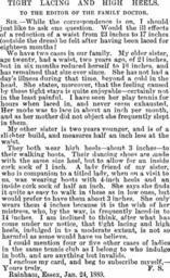 | Keywords: TheFamilyDoctorFeb9 1889page375 .png TIGHT LACING AND HIGH HEELS TO THE EDITOR OF FAMILY DOCTOR SIR --While the correspondence is on I should just like to ask one question Would the ill effects of a reduction of a waist from 23 inches to 17 inches outside the dress be felt after having been laced for eighteen months We have two cases in our family My elder sister age twenty had a waist two years ago of 23 inches but in six months reduced herself to 16 inches and has remained that size ever since She has not had a day's illness during that time beyond a cold in the head She states moreover that the feeling caused by these tight stays is quite enjoyable--certainly not in the least painful I have seen her play tennis for hours when laced in and never seem exhausted Her mode was to bee in about an inch per month and as her mother did not object she frequently slept in them My other sister is two years younger and is of a slighter build and measures half an inch less at the waist They both wear high heels--about 3 inches---to their walking boots Their dancing shoes are made with the same size heel but to allow for an inside cork sock of 1 inch A lady friend of my sister who is companion to a titled lady when on a visit to us was wearing hoots with 4-inch heels and an inside cork sock of half an inch She says she finds it quite as easy to walk in these as in low ones but would prefer to have them about 3 inches She only wears them 4 inches because it is the wish of her mistress who by the way is frequently laced-in to 14 inches I am inclined to think after what has come under my notice that tight lacing and high heels indulged in to a moderate extent is not so harmful as some would have us believe I could mention four or five other cases of ladies in the same tennis club as I belong to who indulge in both and are anything but invalids I enclose my card and beg to subscribe myself -- Yours truly F S Rainham Essex Jan 24 1889 Tightlacing The Family Doctor 1889 Essex from F S PD-Art Artworks missing infobox template |