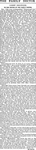 | Keywords: TheFamilyDoctorNov30 1889page218.png CORSET DISCIPLINE TO THE EDITOR OF THE FAMILY DOCTOR SIR -Like your correspondent Science and Art I am an ardent admirer of a very small waist and I fully agree with him that the fact of its having to be produced by tight lacing only adds to its charm Curiously enough as a coincidence exactly the same principle is enunciated in the letter in the same number from Ringlock who speaking of earrings for ladies and the opinion of some people that piercing the ears is barbarous most happily observes that it is just this little bit of barbarousness which gives the earring its piquancy considered apart from its gracefulness This is emphatically true and it is to this delightful piquancy that is due the perpetuation of certain modes whilst others which are elegant only pass away as quickly as those which spring from some passing caprice There is no more piquant charm than that of a fashionably-booted foot A well made dainty boot is exquisitely pretty but had it this recommendation only the style would change incessantly as it does now in certain particulars; whereas the high heel and narrow toe have a power which keeps their charm fresh from year to year however much the ideas of Madame La Mode may vary as to material colour and so on The stylish heel imparts an attractive poise to the foot which nothing can equal whilst the narrow roguish toe also is infinitely smart It likewise is an element of smartness Everyone knows how vastly superior is the witchery of a kid glove for being so tight that it seems like a skin that by some magic is prevented from contracting 1he least vestige of crease or wrinkle And it is just the same with a pretty boot With a slovenly carriage a thick waist and bad boots and gloves the most expensive toilette may appear dowdy in the extreme; whilst a comparatively simple and cheap dress will look wonderfully smart upon a well-corseted figure whose owner is well set-up and who attends to the important details of dressing her hands and her feet in the nattiest manner Such being my view of dress it of course follows naturally that I am a great advocate of giving girls the advantage of frequent drilling and dancing lessons and of insisting upon every requirement of the instructor being met with accuracy and precision Most girls require some standing in the stocks to make them turn out their feet equally and also to accustom them to sit or stand without shuffling their feet about An occasional movement is of course well enough and desirable but constant shuffling and shifting must be rigorously put down The backboard and collar should be used regularly to ensure a good carriage the collar being sometimes used at a very high level indeed; and girls should be accustomed to perform their drill thus whenever required Although I have never been through any personal experiences of these things myself I have had ample opportunities of observing their effects in the person of my wife who had only just before our marriage now five year ago left at the age of nineteen a very strict finishing school where all means were adopted such as those I have referred to for securing to the girls the most elegant and fashionable appearance possib1e Every day there was either a dancing or a drilling lesson and every day the backboard and collar were worn for at least an hour and often for two or three hours The stocks were the certain fate of any girl who had to be twice spoken to as to her feet The corsets were of course of the best and stiffest and laced extremely tight and the chaussure and gloves always of the best and most fashionable To improve the hands it was the invariable rule that every girl slept in her gloves and also that she never went out of the house without them One rule which was no doubt a severe one certainly operated with great success This was to invariably punish any girl who under any circumstances got her gloves or boots soiled and dirty The result was that In time the girls acquired under this dispensation the power commonly supposed to be the special property of Frenchwomen of doing anything without getting glove or boot soiled in the least To this day I often marvel after one of our long walks how it is that my wife has contrived to traverse any quantity of muddy pavement without getting a speck on either boot The health of the girls at her school was excellent and notwithstanding her waist is still but 20 inches when corseted although 27 inches would be nearer the mark when free she has never had a moment's ill-health since I have known her I hope we may soon now have the promised further letter from Carl who deserves great credit for the care taken With his daughters when Moderation last wrote she told us she should be particulal1y careful to be well corseted and shoed on the occasion of her marriage It would be very interesting now if her husband Science and Art would tell us what was the size of her waist and would accurately describe her chaussure both at the ceremony and for the going away Could we also hear what are her views as to gloves -- Yours c RAYMOND Tightlacing The Family Doctor 1889 to Science and Art from Raymond PD-Art Artworks missing infobox template |