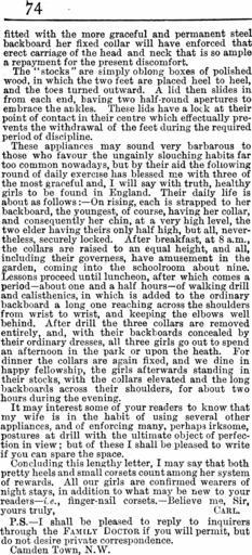 Keywords: TheFamilyDoctorSept28 1889page74.png fitted with the more graceful and permanent steel backboard her fixed collar will have enforced that erect carriage of the head and neck that is so ample a repayment for the present discomfort The stocks are simply oblong boxes of polished wood in which the two feet are placed heel to heel and the toes turned outward A lid then slides in from each end having two half-round apertures to em brace the ankles These lids have a lock at their point of contact in their centre which effectually prevents the withdrawal of the feet during the required period of discipline These appliances may sound very barbarous to those who favour the ungainly slouching habits far too common nowadays but by their aid the following round of daily exercise has blessed me with three of the most graceful and I will say with truth healthy girls to be found in England Their daily life is about as follows --On rising each is strapped to her backboard the youngest of course having her collar and consequently her chin at a very high level the two elder having theirs only half high but all nevertheless securely locked After breakfast at 8 a m the collars are raised to an equal height and all including their governess have amusement in the garden coming into the schoolroom about nine Lessons proceed until luncheon after which comes a period-about one and a half hours--of walking drill and calisthenics in which is added to the ordinary backboard a long one reaching across the shoulders from wrist to wrist and keeping the elbows well behind After drill the three collars are removed entirely and with their backboards concealed by their ordinary dresses all three girls go out to spend an afternoon in the park or upon the heath For dinner the collars are again fixed and we dine in happy fellowship the girls afterwards standing in their stocks with the collars elevated and the long backboards across their shoulders for about two hours during the evening It may interest some of your readers to know that my wife is in the habit of using several other appliances and of enforcing many perhaps irksome postures at drill with the ultimate object of perfection in view; but of these I shall be pleased to write if you can spare the space Concluding this lengthy letter I may say that both pretty heels and small corsets count among her system of rewards All our girls are confirmed wearers of night stays in addition to what may be new to your readers--i e finger-nail corsets --Believe me Sir yours truly CARL P S --I shall be pleased to reply to inquirers through the FAMILY DOCTOR if you will permit but do not desire private correspondence Camden Town N W Tightlacing The Family Doctor 1889 Image TheFamilyDoctorSept28_1889page73 png 1 to P V S ; from Medicus P 2 to Old Fashioned ; from Carl Backboard Collars PD-Art Artworks missing infobox template |