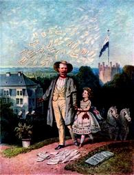 Keywords: Theodor hosemann hermann killisch von horn 1865.png en Painting of Hermann Killisch-Horn 1821 “1886 in 1865 by Theodor Hosemann 1807 “1875 The location of this painting is in Pankow today part of Germany's capital Berlin Hermann Killisch-Horn is shown as 45 year old man walking inside the park of his estate His manor is shown on the left on the right his look-out which reminds of a castle's tower On top of it waves the Prussian flag In the sky surrounding his head are shares/stock of companies while on the grass are issues of the newspaper he founded and owned the Berliner Börsen-Zeitung 1855 “1945 The dress of the young girl also shows the title of this newspaper as she is symbolising the newspaper In other drawings of the founder the newspaper was symbolised by a toddler wrapped in the newspaper de Das Gemälde von Theodor Hosemann 1807 “1875 zeigt den Juristen Journalisten und Unternehmer Hermann Killisch-Horn 1821 “1886 im Jahr 1865 im Alter von 45 Jahren Killisch-Horn ist innerhalb seines Landschaftsgartens abgebildet links sieht man sein Herrenhaus rechts den Aussichtsturm mit gehisster preuĂźischer Flagge Um seinen Kopf herum flattern Aktien diverser Unternehmen im Gras erkennt man Ausgaben der von ihm gegrĂĽndeten Berliner Börsen-Zeitung 1855 “1945 während auf dem Kleid des Mädchens der Name der Zeitung zu erkennen ist In anderen Gemälden und Zeichnungen die den Unternehmer zeigen symbolisiert ein Baby die Zeitung hier ein junges Mädchen 1865 public archive Theodor Hosemann 1807 “1865 other versions PD-old-70-1923 Berlin in the 1860s Paintings of Berlin BĂĽrgerpark Pankow |