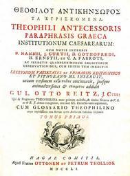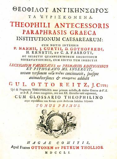 Keywords: Theophili paraphrasis institutionum graeca - WIllhelm Otto Reitz - 1751.jpg en Theophili paraphrasis institutionum graeca Front page of the translation made by WIllhelm Otto Reitz Hague 1751 Theophili paraphrasis institutionum graeca Greek Θεόφιλου αντικήνσορος τα ινστιτούτα was a collection of byzantine legal texts from the time of Justinian I 5th/6th c composed by Theophilus the Antecessor el Θεόφιλου αντικήνσορος τα ινστιτούτα Πρώτη σελίδα της μετάφρασης του Βίλχελμ Όττο Ράιτς Χάγη 1751 Το Θεόφιλου αντικήνσορος τα ινστιτούτα ήταν μια συλλογή νομικών κειμένων α ό τον καιρό του Ιουστινιανού Α´ 5ος/6ος αιώνας τα ο οία συντάχθηκαν α ό τον Θεόφιλο τον Αντικήνσορα 2015-04-24 http //lawlibrary wm edu/wythepedia/index php/File TheophiliAntecessoris1751 jpg Wilhelm Otto Reitz other versions Custom license marker 2015 04 24 PD-old-100 Uploaded with UploadWizard Books in Greek Books in Latin |