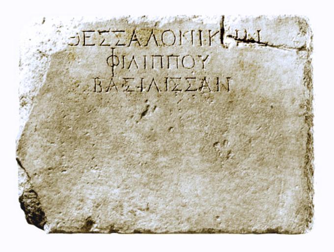 Keywords: Thessaloniki Filippou.jpg Inscribed base of a statue of Thessaloniki of the 2nd c B C found in the area of the ancient Agora and part of a group of statues of the family of Alexander the Great Inscription ΘΕΣΣΑΛΟ ΙΚΗ ΦΙΛΙΠΠΟΥ ΒΑΣΙΛΙΣΣΑ Ενε ίγραφο βάθρο αγάλματος της Θεσσαλονίκης Πρόκειται για τμήμα βάθρου με αγάλματα της οικογένειας του Φιλί ου Β΄ ου είχαν στηθεί εκεί το 2ο αι μ Χ Ένα α ό αυτά σύμφωνα με την ε ιγραφή εικόνιζε τη Θεσσαλονίκη κόρη του Φιλί ου και γυναίκα του Κασσάνδρου ου έδωσε το όνομά της στην όλη Ε ιγραφή ΘΕΣΣΑΛΟ ΙΚΗ ΦΙΛΙΠΠΟΥ ΒΑΣΙΛΙΣΣΑ Archaeological Museum of Thessaloniki 2nd Century B C author PD-Art Ancient Greek inscriptions in the Archaeological Museum Thessaloniki 2nd-century BC inscriptions in Greece 2nd-century BC art in Thessaloniki Philip II |