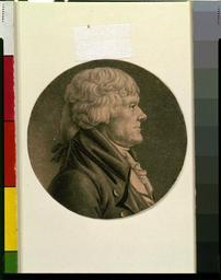 Keywords: Thomas Jefferson, Head-and-Shoulders Portrait, Facing Right WDL14.png Artwork ru Сен- еме Ша ль Балтаза Жульен Фав е 1770-1852 fr Saint-Mémin Charles Balthazar Julien Fevret de 1770-1852 en Saint-Mémin Charles Balthazar Julien Fevret de 1770-1852 zh 桑梅敏 查尔斯 巴萨扎 J F 1770-1852 pt Saint-Memin Charles Balthazar Julien de Févret 1770-1852 ar سانت-ميمن تشارلز بالتاسار جوليان فيفري دي 1770-1852 es Saint-Mémin Charles Balthazar Julien Fevret de 1770-1852 ru Томас Джеффе сон пог удный по т ет с пово отом вп аво fr Thomas Jefferson portrait en buste profil droit en Thomas Jefferson Head-and-Shoulders Portrait Facing Right zh 托马斯· 斐 半 部右侧身像 pt Thomas Jefferson retrato busto virado para a direita ar توماس جيفرسون، صورة شخصية للرأس والكتفين، متجهاً نحو اليمين ru Томас Джеффе сон был т етьим п езидентом Соединенных Штатов Аме ики и одним из отцов-основателей еспублики олодая нация все еще находилась в п оцессе становления и политические деятели являлись популя ной темой абот сов еменных художников подобно тому как в п ошлом являлось т адицией запечатлевать на холсте ко олей п едставителей а исток атии и духовенства Создавая по т еты выдающихся политических деятелей художники-по т етисты также надеялись получить значительный гоно а либо от самих политиков либо от лиц из их ближайшего ок ужения Ф анцузский художник Ша ль Бальтаза Жульен Фев е де Сен- емен 1770-1852 гг создал две г авю ы Джеффе сона хотя исследования указывают на то что он пе еделал более анний по т ет для создания вто ой г авю ы Для точности пе едачи п опо ций лица своих нату щиков Сен- емен использовал физионот ас -- изоб етение п ивезенное им из своей  одной Ф анции Физионот ас позволял с высокой точностью повто ять че ты лица человека с кото ого исуется по т ет Этот метод стал весьма популя ен с еди аме иканских г аве ов того им пользовались и основные конку енты Сен- емена художники династии Пил <br>Джеффе сон Томас 1743-1826 гг ; Реп одукции по т етов; По т еты fr Thomas Jefferson fut le troisième président des États-Unis d'Amérique et l'un des pères fondateurs de la république La nation cherchait encore à consolider son identité et les personnalités politiques devinrent un thème populaire pour les artistes contemporains tout comme les rois les aristocrates et les personnalités religieuses l'avaient été auparavant Les portraitistes espéraient aussi gagner de l'argent en peignant des personnages politiques importants en étant payés soit par le sujet lui-même soit par des enthousiastes de son entourage L'artiste français Charles Balthazar Julien Fevret de Saint-Mémin 1770-1852 fit deux gravures de Jefferson bien que les recherches suggèrent qu'il retoucha l'ancien portrait pour la deuxième gravure Pour représenter exactement les proportions du visage de ses modèles Saint-Mémin se servait d un « physionotrace » une invention qu'il avait apportée avec lui de sa France natale Le physionotrace était un mécanisme conçu pour tracer le profil d'un sujet avec une grande exactitude Cette méthode devint pour un temps très populaire parmi les graveurs américains y compris les rivaux artistiques de Saint-Mémin les Peale <br>Jefferson Thomas 1743-1826; Portraits en images; Portraits en Thomas Jefferson was the third president of the United States of America and one of the founding fathers of the republic With the nation still in the process of solidifying its identity political figures became a popular subject for contemporary artists much as kings aristocracy and religious figures had been in the past Portrait painters also hoped to earn money by painting politically important individuals either from the subject himself or from enthusiasts in his entourage The French artist Charles Balthazar Julien Fevret de Saint-Mémin 1770-1852 did two engravings of Jefferson although research suggests that he retooled the old portrait for the second engraving For the accurate depiction of his sitters facial proportions Saint-Mémin relied upon the physiognotrace an invention that he brought with him from his native France The physiognotrace was a mechanism designed to trace a subject s profile with great exactitude This method became quite popular among American engravers for a time including with Saint-Mémin s artistic rivals the Peales <br>Jefferson Thomas 1743-1826; Portrait prints; Portraits zh 托马斯· 斐 是美国的第三任 统,也是美国的建国国父之 当时的美国仍 巩固自身的 位,于是政治人物便成了同时代画家钟爱的创 对象,这与之前对待国王 贵族和宗教人士的 度 些类似 人像画家同时也希 能从给重要政治人物绘画中谋利,利润不是 自被画的人物 身就是 自支持该人物的民众 法国画家 Charles Balthazar Julien Fevret de Saint-Mémin(1770-1852 年)曾经两次为 斐 画像(尽管研究表明