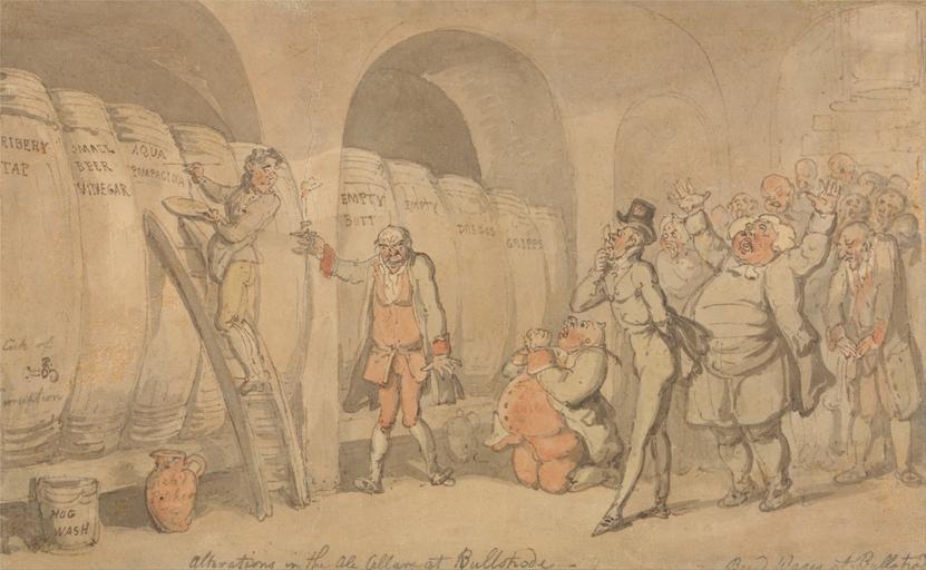 | Keywords: Thomas Rowlandson - Alterations in the Ale Cellar at Bullstrode - Google Art Project.jpg Inscribed in pen and brown ink and graphite lower center alterations in the Ale Cellar at Bull Strode - ; in pen and gray ink and graphite lower right Board Wages at Bull Strode Inscription _Signed_and_Dated Not signed not dated Not on View Watercolor with pen and red-brown ink over graphite on moderately thick moderately textured cream wove paper men archways alterations cellar ladder jug barrels containers genre subject special url_id 0QF5JkF96iCe2A PD-old-100-1923 1827 Drawings and watercolours by Thomas Rowlandson Google Art Project works by Thomas Rowlandson Quizzing glasses Cellars |