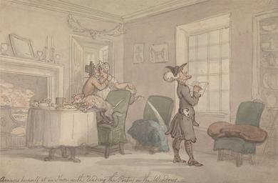 | Keywords: Thomas Rowlandson - Dr. Syntax Copying the Wit of the Window - Google Art Project.jpg Google Art Project watercolor London 1756 London 1827 Thomas male 2332358 Rowlandson British 1756 - 1827 /collection/yale-center-for-british-art/artwork/dr-syntax-copying-the-wit-of-the-window-thomas-rowlandson/2435334/ Thomas Rowlandson Artist /artist/thomas-rowlandson/4131603/ 4131603 /collection/yale-center-for-british-art/ Yale Center for British Art 2305845 http //britishart yale edu/ 2/23/2012 10 35 22 PM /collection/yale-center-for-british-art/artwork/dr-syntax-copying-the-wit-of-the-window-thomas-rowlandson/2435334/ 1809 between 1809 and 1812 Wit dog animal kissing dinner eating maid meal youth elderly men woman writing copying bone linens table fireplace doorway window inn candlesticks chairs shelves china candles table support furniture hats teapot dishes genre subject kettle Watercolor with pen and gray and red-brown ink over graphite verso graphite tracing of recto design on medium moderately textured beige wove paper 137 2435334 False 1812 3/24/2012 9 20 59 PM YCBA/lido-TMS-5753 http //collections britishart yale edu/vufind/Record/1670035 Yale Center for British Art Paul Mellon Collection painting 1800 1820 London Creation w208 x h137 cm between 1809 and 1812 False 1 52380952380952 Item dr-syntax-copying-the-wit-of-the-window-thomas-rowlandson Dr Syntax Copying the Wit of the Window d 208 Inscribed in pen and gray ink lower left Amuses himself at an Inn with Reading the Poetry on the Windows --- Inscription _Signed_and_Dated Not signed not dated Not on View Watercolor with pen and gray and red-brown ink over graphite verso graphite tracing of recto design on medium moderately textured beige wove paper Wit dog animal kissing dinner eating maid meal youth elderly men woman writing copying bone linens table fireplace doorway window inn candlesticks chairs shelves china candles table support furniture hats teapot dishes genre subject kettle special url_id DQEQNd5-iBmNXw PD-old-100-1923 1827 Doctor Syntax in Search of the Picturesque - drawings by Thomas Rowlandson 1 06 Google Art Project works by Thomas Rowlandson |
