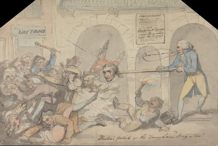 Keywords: Thomas Rowlandson - Drury Lane. The School for Scandal - Google Art Project.jpg Inscribed in black ink upper left signage ROSE TAVERN ; in brown ink upper right signage on wall School for Scandal --- --- --- --- --- --- and Charles by Mr Honorble to which will be addes who's the Dupe --- --- --- ; in brown ink center right in bubble Boo---oo---oo-- ; in brown ink lower right Thalia's frolick or the Drury Lane Bug'a'boo ; in black ink verso upper left Wigstead ; in brown ink verso upper center Radishes New Cheese ; in brown ink verso upper right numerical computations ; in graphite verso lower right D-1984; in blue ink verso lower center PAUL MELLON COLLECTION collector's stamp; in brown ink verso center left numerical computations Inscription _Signed_and_Dated Not signed not dated Not on View Watercolor with pen and black gray and brown ink over graphite on moderately thick moderately textured beige laid paper satire head school men women stick archways tavern hats genre subject special url_id BgEdOhN0OtANLg PD-old-100-1923 1827 Drawings and watercolours by Thomas Rowlandson Google Art Project works by Thomas Rowlandson |