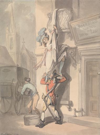 | Keywords: Thomas Rowlandson - The Elopement - Google Art Project.jpg No inscription Inscription _Signed_and_Dated Signed and dated in pen and black ink lower left Rowlandson 1792 Not on View Watercolor with pen and gray and black ink over graphite on medium slightly textured white wove paper pink color red blue soldier youth man woman ribbon balcony doorway wheels church boarding school sheet bed covering hats stockings dress in general uniform sword boots luggage coach carriage genre subject special url_id SwH5MLAr5A_hgA PD-old-100-1923 1827 Drawings and watercolours by Thomas Rowlandson Google Art Project works by Thomas Rowlandson |