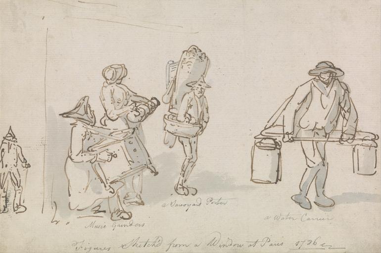 | Keywords: Thomas Rowlandson - Parisian Street Figures - Google Art Project.jpg  Inscribed in pen and gray ink left to right center Music Grinders a Danoy and Porter a Water Carrier ; in gray ink lower center Figures Sketch'd from a Window at Paris 1786--- ; verso in royal blue ink center Paul Mellon Collection seal; in graphite lower right D3577 1/6 Inscription _Signed_and_Dated Not signed not dated Not on View Pen and brown and gray ink with gray wash over graphite; verso watercolor splotches on medium moderately textured blued white laid paper men musician figures street instrument genre subject special url_id xQEc7m25I3ivMA PD-old-100-1923 1827 Drawings and watercolours by Thomas Rowlandson Google Art Project works by Thomas Rowlandson Drawings of Paris 1786 drawings |