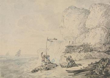 Keywords: Thomas Rowlandson - Shipwrecked Sailors - Google Art Project.jpg Inscribed in dark gray ink lower left TEL collectors stamp verso lower left Paul Mellon Collection stamp Inscription _Signed_and_Dated Not signed not dated Not on View Watercolor with pen and black and gray ink over graphite on medium slightly textured blued white laid paper sailors shipwreck rocks water cliffs shore landform ships landscape marine art special url_id 5QGt64a4aaUdXA PD-old-100-1923 1827 Drawings and watercolours by Thomas Rowlandson Google Art Project works by Thomas Rowlandson Sailors in art |