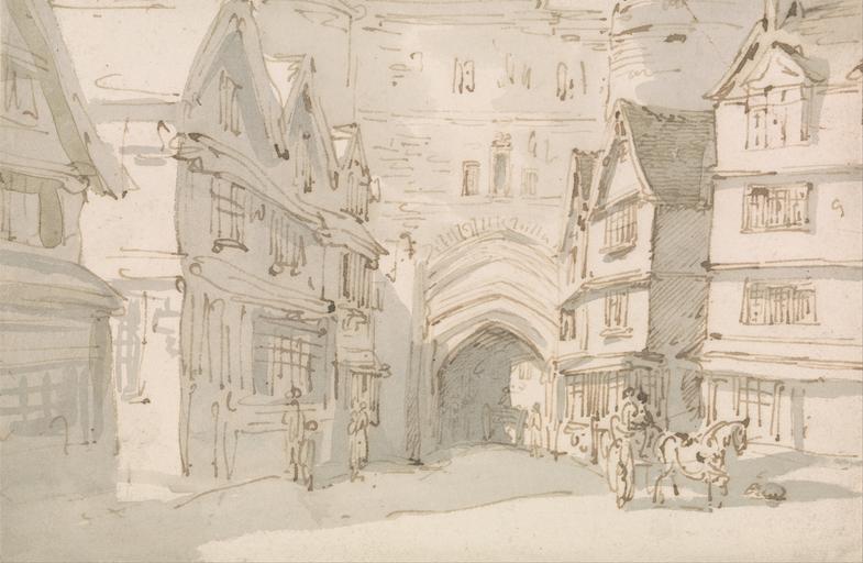 | Keywords: Thomas Rowlandson - The South Gate, Exeter - Google Art Project.jpg  Inscribed in royal blue ink lower right Paul Mellon Collection seal D28141 LX Inscription _Signed_and_Dated Not signed not dated Not on View Pen and brown ink and wash on medium slightly textured blued white wove paper architectural subject horse animal south gate windows archway town buildings carriage cityscape figures representations special url_id -wEGCAHob_dDbg PD-old-100-1923 1827 Drawings and watercolours by Thomas Rowlandson Google Art Project works by Thomas Rowlandson History of Exeter |