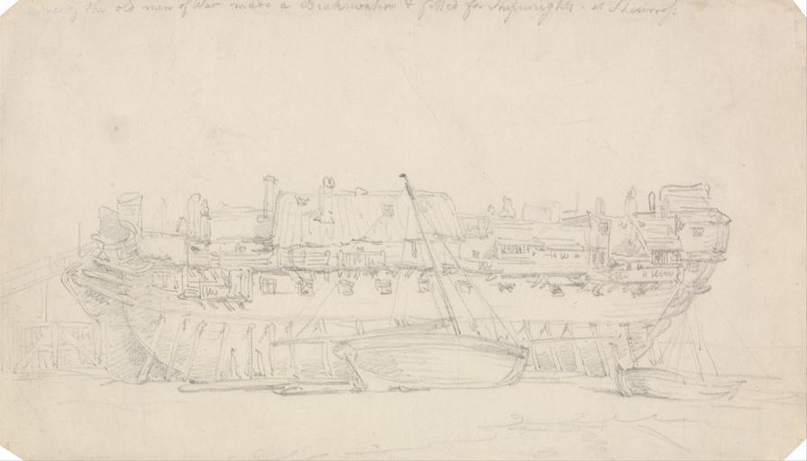 | Keywords: Thomas Rowlandson - Study of a Hulk - Google Art Project.jpg Inscribed in graphite upper center One of the old men of War made a Brakewater and fitted for Shipwrights at Sherness Inscription _Marks watermarks horn design 1802 ; not in Shorter not in Churchill similar to no 324 Heawood see pls 352 353 Inscription _Signed_and_Dated Not signed not dated Not on View Graphite on medium slightly textured blued white laid paper oars ship ship study visual work marine art marine art hulk watercraft by form hulk watercraft by form boats boats special url_id egEwq1-CpZ_P6A PD-old-100-1923 1827 Drawings and watercolours by Thomas Rowlandson Google Art Project works by Thomas Rowlandson Drawings of ships |