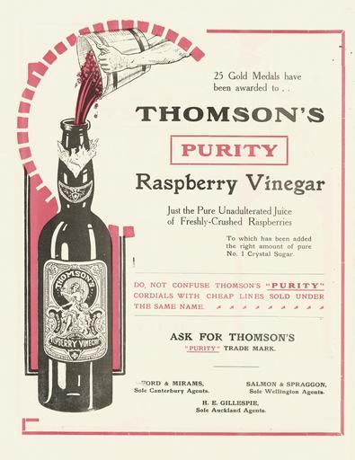 Keywords: text Shows a bucket of raspberries being tipped into a very large bottle of Thomson's raspberry vinegar, made of raspberry juice and sugar. There is an exhortation not to "confuse Thomson's "Purity" cordials with cheap lines sold under the same name". Sole agents were: Ford & Mirams (Canterbury), Salmon & Spraggon (Wellington), and H E Gillespie (Auckland) Quantity: 1 colour photo-mechanical print(s) on pamphlet. Physical Description: Offset print on folded pamphlet, 297 x 230 mm. Provenance: Purchased from Barney Brewster, Nelson, in 2004. Thomson & Company (Dunedin) :Thomson's "Purity" raspberry vinegar. [ca 1910]. [Pamphlet advertising Methven boilers and pipes, Creamoata, Thomson's Purity Raspberry Vinegar, and Thomson's Purity Lime Juice. ca 1910].. Ref: Eph-B-RETAIL-1910-01-03. Alexander Turnbull Library, Wellington, New Zealand. natlib.govt.nz/records/22701749 Shows a bucket of raspberries being tipped into a very large bottle of Thomson's raspberry vinegar, made of raspberry juice and sugar. There is an exhortation not to "confuse Thomson's "Purity" cordials with cheap lines sold under the same name". Sole agents were: Ford & Mirams (Canterbury), Salmon & Spraggon (Wellington), and H E Gillespie (Auckland) Quantity: 1 colour photo-mechanical print(s) on pamphlet. Physical Description: Offset print on folded pamphlet, 297 x 230 mm. Provenance: Purchased from Barney Brewster, Nelson, in 2004. Thomson & Company (Dunedin) :Thomson's "Purity" raspberry vinegar. [ca 1910]. [Pamphlet advertising Methven boilers and pipes, Creamoata, Thomson's Purity Raspberry Vinegar, and Thomson's Purity Lime Juice. ca 1910].. Ref: Eph-B-RETAIL-1910-01-03. Alexander Turnbull Library, Wellington, New Zealand. natlib.govt.nz/records/22701749 |