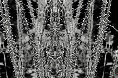 Keywords: thorns thorn macro rose flower stems sharp protection nature perennial black white background