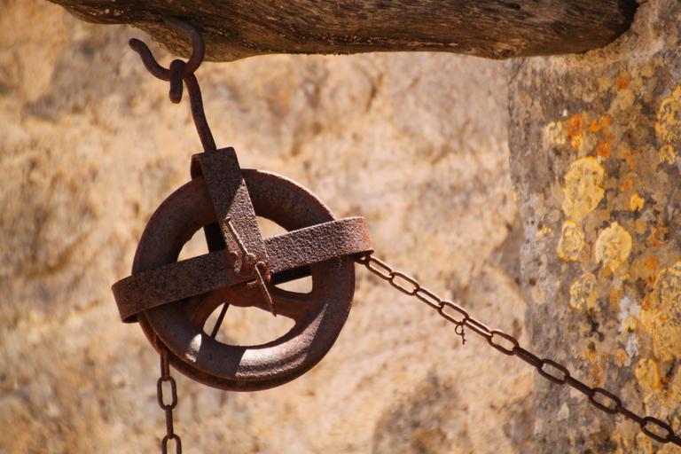 Keywords: thread chain hoist wheel role chain alloy wheel metal old ailing rusted rusty iron chain fountain wall masonry antique facade mechanics wood chains mechanically technology turn close hook