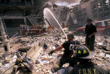 Keywords: Three New York City fire fighters spraying water on smoldering ruins following the September 11th terrorist attack on World Trade Center, New York City. Sept. 11, 2001. Image. Retrieved from the Library of Congress, www.loc.gov/pictures/item/2002719368/. (Accessed September 03, 2016.) Call Number: LC-A05- E16 [item] [P&amp;P] Forms part of: Collection of unattributed photographs ... The 250 color slides made at the World Trade Towers in New York City on September 11, 2001, received from the New York District Attorney's office from an unattributed photographer, are in the public domain. Privacy and publicity rights may apply. These slides were received from the New York District Attorney's office with the photographer relinquishing any and all copyright and right of attribution. Therefore, the photographer's name will not be associated with these photographs. Note – This image has been digitally adjusted for one or more of the following: - fade correction, - color, contrast, and/or saturation enhancement - selected spot and/or scratch removal - cropped for composition and/or to accentuate subject matter - straighten image Three New York City fire fighters spraying water on smoldering ruins following the September 11th terrorist attack on World Trade Center, New York City. Sept. 11, 2001. Image. Retrieved from the Library of Congress, www.loc.gov/pictures/item/2002719368/. (Accessed September 03, 2016.) Call Number: LC-A05- E16 [item] [P&P] Forms part of: Collection of unattributed photographs ... The 250 color slides made at the World Trade Towers in New York City on September 11, 2001, received from the New York District Attorney's office from an unattributed photographer, are in the public domain. Privacy and publicity rights may apply. These slides were received from the New York District Attorney's office with the photographer relinquishing any and all copyright and right of attribution. Therefore, the photographer's name will not be associated with these photographs. Note – This image has been digitally adjusted for one or more of the following: - fade correction, - color, contrast, and/or saturation enhancement - selected spot and/or scratch removal - cropped for composition and/or to accentuate subject matter - straighten image <em>Three New York City fire fighters spraying water on smoldering ruins following the September 11th terrorist attack on World Trade Center, New York City</em>. Sept. 11, 2001. Image. Retrieved from the Library of Congress, <a href="http://www.loc.gov/pictures/item/2002719368/" rel="nofollow">www.loc.gov/pictures/item/2002719368/</a>. (Accessed September 03, 2016.)