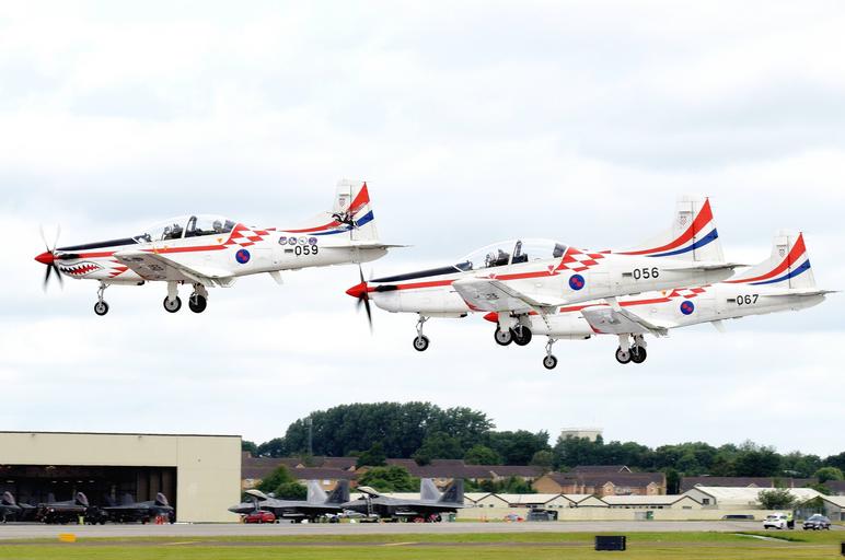 Keywords: Three Pilatus PC-9 arrive RIAT Fairford 7July2016 arp.jpg Three of the six Pilatus PC-9M aircraft of the Croatian Air Force aerobatic display team 'Krila Oluje' arrive at the 2016 Royal International Air Tattoo Gloucestershire England In the hangar are three F-35 Lightnings and outside two F-22 Raptors My own photo taken with a Nikon D5300 DSLR and Tamron 70-300 lens Taken 7th July 2016 Myself Adrian Pingstone arpingstone Pilatus PC-9 at the 2016 Royal International Air Tattoo Krila Oluje Taken with Nikon D5300 |
