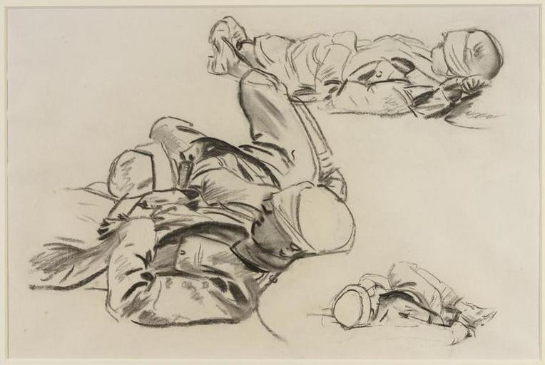 | Keywords: Three studies of soldiers with bandaged heads.jpg Artwork en Three studies of soldiers with bandaged heads 1918 charcoal paper cm 481 625 http //www iwm org uk/collections/item/object/23745 Imperial War Museum Creator John Singer Sargent three studies of gassed British infantrymen lying on the ground The three men lie with their heads resting on improvised pillows made of blankets and equipment with their eyes covered with bandages PD-old-auto-1923 1925 Collections of the Imperial War Museum Gassed |