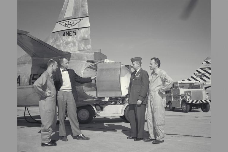 Keywords: naca nasa nasa ames research center nasaamesresearchcenter george cooper georgecooper 1958 Description: Ames Chief test pilot George Cooper discusses phases of flight evaluation tests. NACA personnel (l to R) Air Force Major E. Sommerich; Ames Engineer Seth Anderson, Lt. Col. Tavasti; and George Cooper pose in front of the thrust reverser on F-94C01. Note: Used in publication in Flight Research at Ames; 57 Years of Development and Validation of Aeronautical Technology Image #: Date: May 21, 1958 Description: Ames Chief test pilot George Cooper discusses phases of flight evaluation tests. NACA personnel (l to R) Air Force Major E. Sommerich; Ames Engineer Seth Anderson, Lt. Col. Tavasti; and George Cooper pose in front of the thrust reverser on F-94C01. Note: Used in publication in Flight Research at Ames; 57 Years of Development and Validation of Aeronautical Technology Image #: Date: May 21, 1958 |