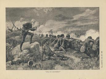 | Keywords: Thure de Thulstrup - H. Rider Haggard - Maiwa's Revenge - Fire, you scoundrels original scan.png File Thure de Thulstrup - H Rider Haggard - Maiwa's_Revenge_- Fire you scoundrels jpg Illustration from H Rider Haggard's Maiwa's Revenge Chapter VII by Thure de Thulstrup The scene shows Allan Quartermain ordering the men to fire after getting them to wait until the most opportune moment Now they are going to begin I thought to myself and I was not far wrong for in another minute the body of men divided into three companies each about five hundred strong and heralded by a running fire charged at us on three sides Our men were now all well under cover and the fire did us no harm I mounted on a rock so as to command a view of as much of the koppie and plain as possible and yelled to our men to reserve their fire till I gave the word and then to shoot low and load as quickly as possible I knew that like all natives they were sure to be execrable shots and that they were armed with weapons made out of old gas-pipes so the only chance of doing execution was to let the enemy get right on to us On they came with a rush They were within eighty yards now and as they drew near the point of attack I observed that they closed their ranks which was so much the better for us Shall we not fire my father sung out the captain No ”confound you I answered Sixty yards ” fifty ” forty ” thirty Fire you scoundrels I yelled setting the example by letting off both barrels of my elephant gun into the thickest part of the company opposite to me Harper's New Monthly Magazine Vol LXXVII No 459 26 p 351 1888-08 creator Thure de Thulstrup H Rider Haggard Author 1856-1925 PD-US As Thulstrup and Haggard are Europeans it is worth pointing out this is also PD-Old File Thure de Thulstrup - H Rider Haggard - Maiwa's_Revenge_- Fire you scoundrels jpg Restored JPEG File Thure de Thulstrup - H Rider Haggard - Maiwa's_Revenge_- Fire you scoundrels png Restored Archival PNG File Thure de Thulstrup - H Rider Haggard - Maiwa's_Revenge_- Fire you scoundrels original scan png Original scan PNG Henry Rider Haggard Thure de Thulstrup Allan Quatermain 1888 Battles in art Maiwa's Revenge |