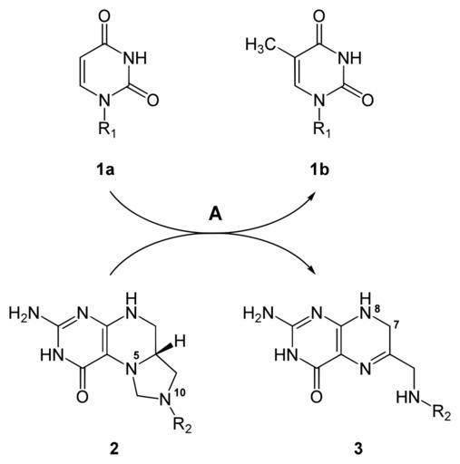 | Keywords: Thymidylate synthase reaction.svg en dUMP 1a is methylated to dTMP 1b by the thymidylate synthase A Hereby 5 10-Methylenetetrahydrofolate 2 is converted to 7 8-dihydrofolate 3 thymidylate synthase de Die Synthese von dTMP 1a aus dUMP 1b wird durch die Tyhmidylat-Synthase A katalysiert Die Methylgruppe stammt aus N5 N10-Methylentetrahydrofolat 2 das zu 7 8-Dihydrofolat 3 umgesetzt wird Own Yikrazuul 11 7 08 Nitrogen compounds Pyrimidines Folate Transferases Nucleotide metabolism | ||||
