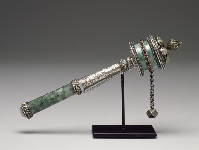 | Keywords: Tibetan - Portable Prayer Wheel - Walters 572285 - Profile.jpg  Just as the Buddha symbolically turned the wheel of the Law when he preached his first sermon and taught the way to enlightenment at Sarnath India so pious Tibetan Buddhists literally rotate a wheel to earn the merit that will enhance the likelihood of enlightenment The Tibetan prayer wheel however is not an ordinary wheel but a cylindrical metal drum that rotates around an axis There are two such wheels those that are immovable and placed inside or outside a shrine and those that are carried by hand like this example It is not an uncommon sight to see a Tibetan constantly rotating the hand wheel and chanting a mantra as he or she walks in the same way the pious Catholics use their rosaries This particular example is a handsome ensemble of jadeite and silver inlaid with more jadeite turquoise and rubies Part of the handle is in silver chased with a foliate design reminiscent of Derge work but it could have been made elsewhere Therefore it is extremely difficult to be certain of the place of manufacture or the date of this work It could have been made somewhere in eastern Tibet of even Mongolia where such gem-embellished ritual implements have remained very popular Whatever its exact date or provenance it is an elegantly sumptuous and well-crafted object that was probably made for a wealthy and important patron century 17 18 silver green jadeite rubies turquoise cm 21 5 accession number 57 2285 21538 John and Berthe Ford Baltimore date and mode of acquisition unknown Walters Art Museum John Berthe Ford 2002 Desire and Devotion Art from India Nepal and Tibet in the John and Berthe Ford Collection The Walters Art Museum Baltimore; Birmingham Museum of Art Birmingham; Santa Barbara Museum of Art Santa Barbara; Albuquerque Museum Albuquerque 2001-2003 Pilgrimage and Buddhist Art Asia Society New York 2010 place of origin Mongolia Walters Art Museum license Tibetan art in the Walters Art Museum Prayer wheels Media contributed by the Walters Art Museum needs artist review |