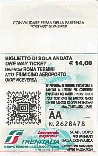 Keywords: Ticket Leonardo Express.jpg Railway ticket for Leonardo Express Roma Termini - Fiumicino Aeroporto Leonardo da Vinci own scan 2015 Trenitalia PD-ineligible cc-zero Rail tickets of Italy Leonardo Express