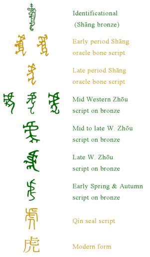 | Keywords: Tiger colored gif.gif en Chart comparing Chinese character 虎 hu3 'tiger' from bronze inscriptions to other forms Created entirely by uploader in Word and Photoshop using CGI rendition of tiger clan emblem from rubbing plus typed bronze oracle bone and seal fonts made available for public use by the Academia Sinica's Chinese Document Processing Laboratory CDPL under the Institute of Information Science with assistance from the Bronze Inscription Research Team BIRT under the Institute of History and Philology of the Academia Sinica Own Dragonbones 2008-05-31 na na na Bronze inscriptions 虎 Chinese character for tiger |