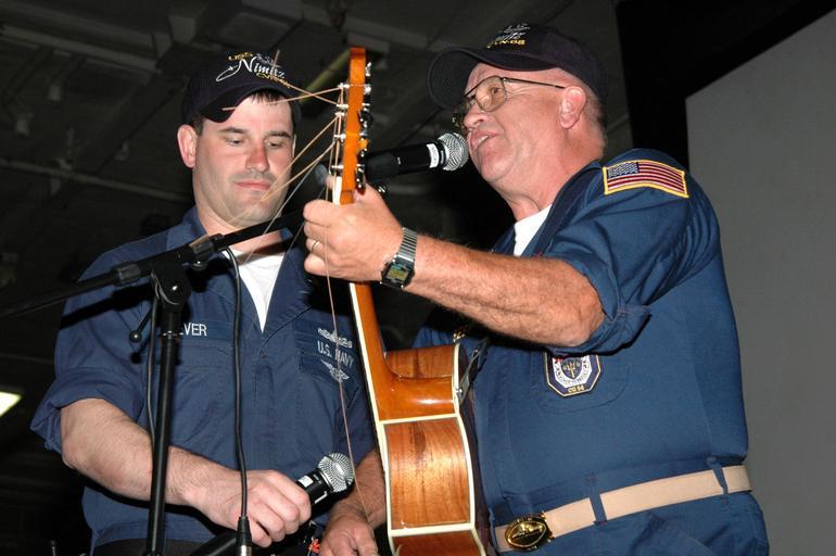 Keywords: Tiger Cruise Talent Show DVIDS59756.jpg en Larry Seever a retired Navy chief performs a song with some help from his son Petty Officer 2nd Class Shawn Seever during the Tiger Cruise Talent Show Sept 25 aboard nuclear-powered aircraft carrier USS Nimitz CVN 68 Nimitz Strike Group and embarked Carrier Air Wing CVW 11 are returning to their homeport of San Diego after a six-month deployment 2007-09-25 Petty Officer 2nd Class Kristen Allen https //www dvidshub net/image/59756 070925-N-+++++-080 2007-09-28 11 37 USPACOM AT SEA PD-USGov-Military-Navy USS Nimitz CVN-68 Images from DoD uploaded by Fæ |