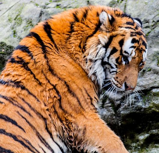 Keywords: tiger looking close up wild animal big cat wildlife feline mammal nature portrait outdoors stripes zoo enclosure wet