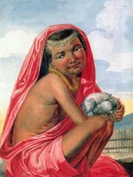 Keywords: Tikhanov - Young Girl of the Sandwich Islands (1818).jpg en Young Girl of the Sandwich Islands Portrait by Russian artist Mikhail Tikhanov in 1818 Watercolor over pencil 18 1/4 X 13 1/16 in 46 4 X 33 2 cm Scientific Research Museum of the USSR Academy of Arts Saint Petersburg Done when the frigate Kamchatka was in Honolulu In the hand of the girl is possibly a Hawaiian Poi Dog which went extinct in the 19th-century <blockquote>The porpriat of a young Hawaiian girl and her pet dog is perhaps Tikhanov's most appealing watercolor The girl is shown crouching her knees drawn up and her feet neatly tucked under as if arranged to fit the confines of the page She turns her head to face outward at a slightly awkward angle but she seems at ease absorbed in her own thoughts Her small dog rests on her knees curled up The young girl wears about her waist a pink pāʻū skirt of the finest and softest manufacture Her matching kihei or wrapper is thrown across her left shoulder over head and down her back An additional detail of the girl's costume is the lei of hala' fruit segments perhaps worn as a sign of mourning for the recent death of Kamehameha I's sister The identity of the girl is unknown but she must have been of high status because of her elegant consume and band of lime-bleached hair a dressing much in vogue at the time among women of royal rank </blockquote> cite book Forbes David W Encounters with Paradise Views of Hawaii and Its People 1778-1941 1992 Honolulu Honolulu Academy of Arts 978-0-7103-0454-4 24550242 68 creator Mikhail Tikhanov 1818-10 Mikhail Tikhanov 1818 paintings from Russia Dogs of Hawaii Hawaii in the 1810s Native Hawaiians in art Paintings of girls with dogs Kihei garment PD-old-100 |