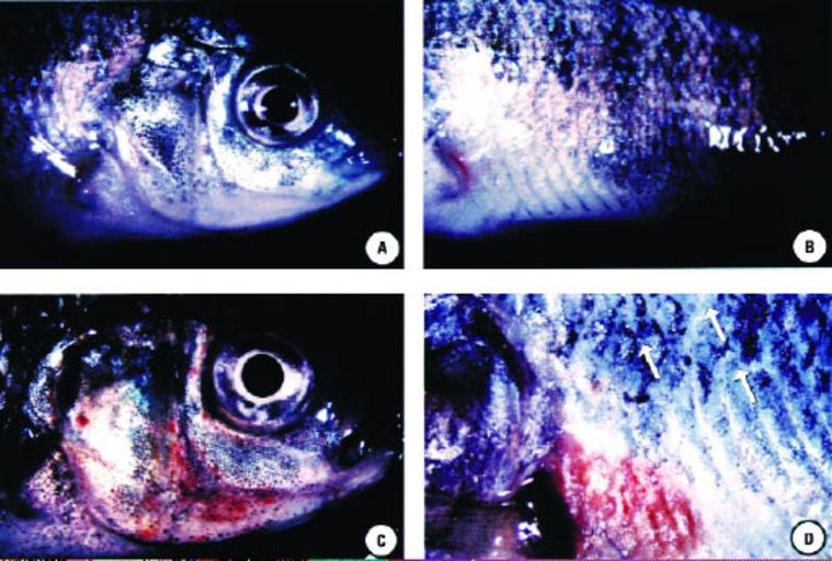 | Keywords: Tilapia Pfiesteriosis.jpg Acute pfiesteriosis in tilapia Oreochromis spp exposed to Pfiesteria shumwayae under laboratory conditions A Normal appearance of control fish head region B Normal appearance of flank C Petecchial hemorrhage over operculum after acute lethal exposure D Focal erythema caudal to pectoral fin arrowhead loss of mucus coat epidermis and scales along flank arrows http //www ehponline org/members/2001/suppl-5/687-693vogelbein/vogelbein-full html Skin Ulcers in Estuarine Fishes A Comparative Pathological Evaluation of Wild and Laboratory-Exposed Fish Environmental Health Perspectives Volume 109 Supplement 5 pp 687-693 2001-10 Vogelbein et al http //www ehponline org/docs/admin/copyright html Public Domain PD-USGov Diseases and disorders of fish Pfiesteria Oreochromis |