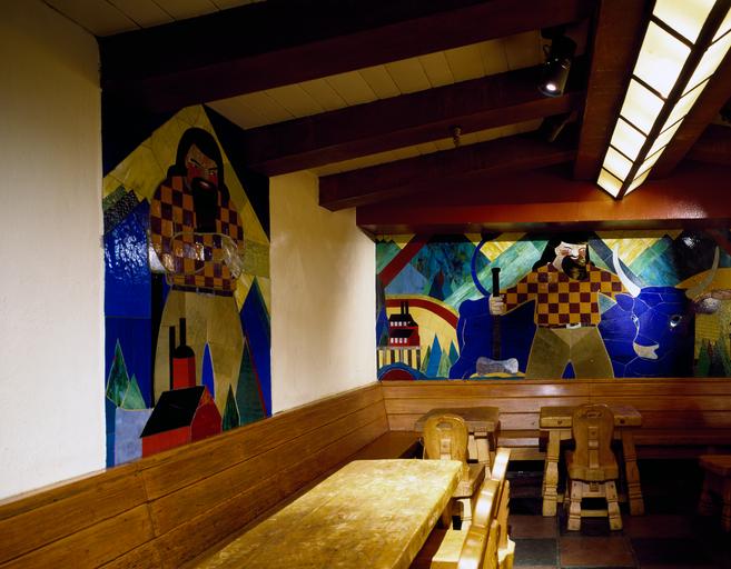 | Keywords: Timberline-Lodge-Blue-Ox-Art.jpg en Artwork at Timberline Lodge halfway up Mount Hood in Oregon Created by a W P A worker at the lodge during the Great Depression Stained glass murals of Paul Bunyan and Babe the blue ox created by Virginia Darce 1936 “38 http //www wpamurals com/timberli htm Source LOC-image highsm 16636 Creator Carol M Highsmith between 1980 2006 PD-Highsmith Timberline Lodge murals Photographs by Carol M Highsmith Glass murals | ||||