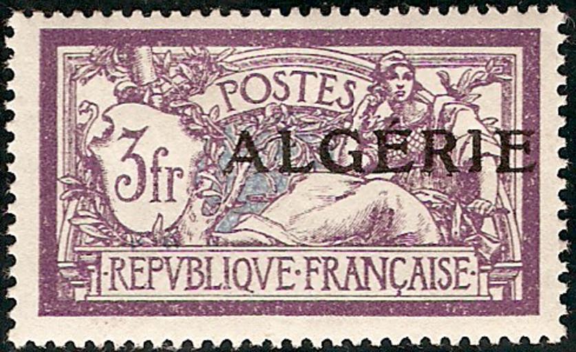 | Keywords: Timbre Agérie Merson 3f.png Timbre d'Algérie au type Merson de 1924 travail personnel - scan d'une pièce de ma collection 2008-02-10 Ducloy Luc-Olivier Merson 1846 - 1920 ; scanned by Yann PD-1996 1920 Stamps of French post in Algeria Overprints Type Merson 1924 stamps |