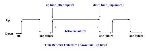 Keywords: Time between failures.svg en To explain the background of MTBF calculation Own work by uploader based on Andjohn2000 Time_between_failures jpg Ferdna Andjohn2000 10/06/2008 Systems engineering Safety