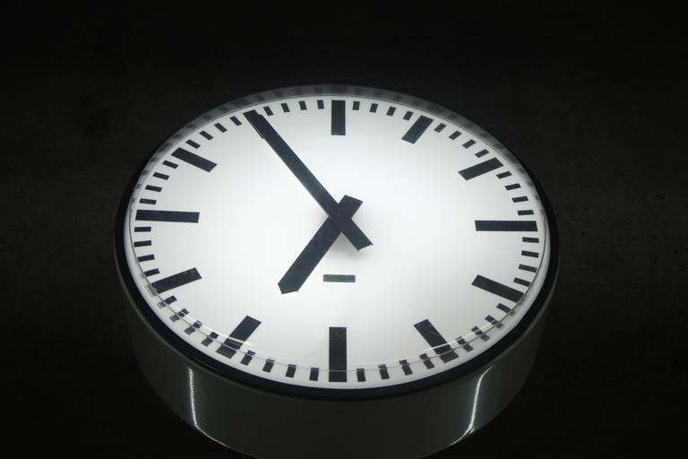 Keywords: time clock evening black white night day seven six number dial second minute symbol ticking watch train