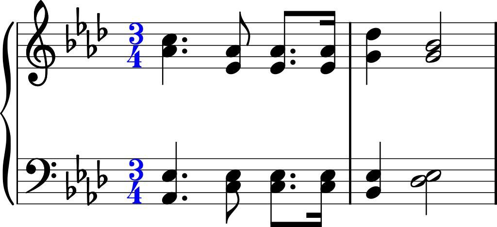 | Keywords: Time signature example.svg An example time signature The music is the opening of Ludwig van Beethoven's Piano Sonata No 31 Image generated from the following LilyPond file <pre> \version 2 8 0 \layout ragged-right t \new PianoStaff << \new Staff \time 3/4 \clef treble \key aes \major < c aes' > 4 < aes' ees' > 8 < aes' ees' > 8 < aes' ees' > 16 < des g' > 4 < bes' g' > 2 \new Staff \clef bass \key aes \major < ees aes > 4 < ees c > 8 < ees c > 8 < ees c > 16 < ees bes > 4 < ees des > 2 >> </pre> own Wereon Time signatures |