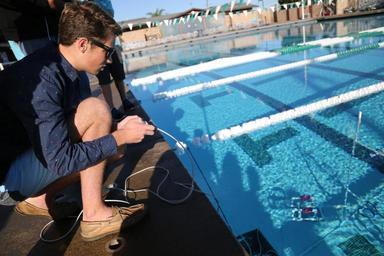 Keywords: Timed maneuvering challenge 150128-N-ZZ999-079.jpg en William O ™Brien a high school senior at Coronado High School controls an underwater Remote Operated Vehicle during a timed maneuvering challenge to pick up hanging rings and move them to a basket as part of the ONR Sea Perch challenge The Office of Naval Research ™s Sea Perch Program is an innovative underwater robotics program that equips teachers and students with the resources they need to build an underwater ROV in an in-school or out-of-school setting Students build the ROV from a kit comprised of low-cost easily accessible parts following a curriculum that teaches basic engineering and science concepts with a marine engineering theme 2015-01-30 ROV https //www dvidshub net/image/1749016 150128-N-ZZ999-079 2015-02-02 23 45 SAN DIEGO CA US PD-USGov-Military-Navy Office of Naval Research Images from DoD uploaded by Fæ |