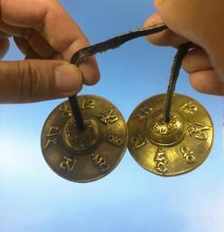 Keywords: tinsha chibettan bell sanskrit characters hand finger sound healing brass metal golden