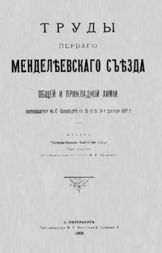 | Keywords: Title page Works of 1st Mendeleevsky Congress St Petersburg 1907.jpg en Title page Works of 1st Mendeleev Congress St Petersburg 1907 ru Титульный лист 1-го енделеевского съезда С -Пете бу г 1907 В В Козлов Оче ки исто ии химических обществ СССР Изд А СССР 1958 Serge Lachinov об аботка дляя wiki 2009 International Mendeleev Congresses PD-Art | ||||