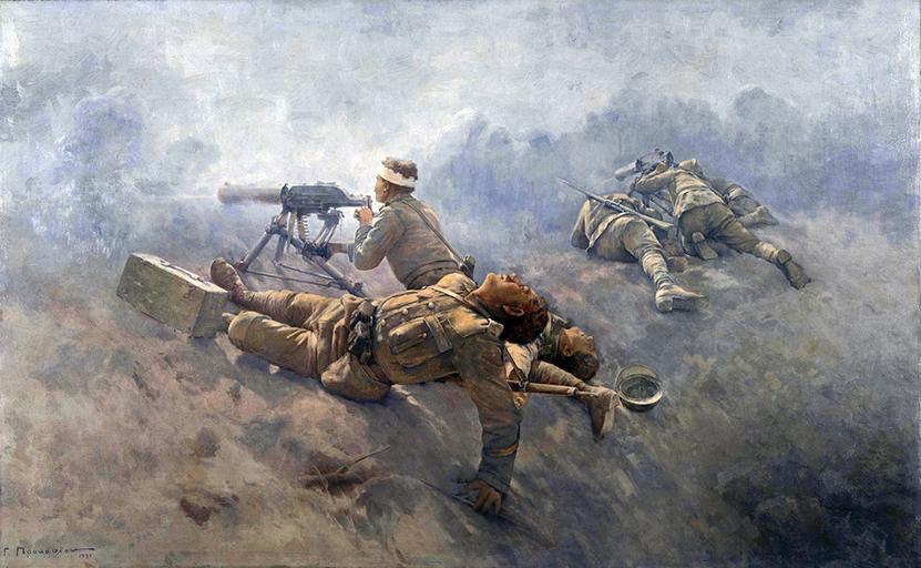 Keywords: To the Last Man Prokopiou.jpg el έχρις Εσχάτων 1921 Γέώργιος Προκο ίου Συλλογή Εθνικής Τρά εζας της Ελλάδας Εικονίζονται Έλληνες Στρατιώτες κατά τις ε ιχειρήσεις της ικράς Ασίας το 1921 en To the Last Man έχρις Εσχάτων 1921 Georgios Prokopiou Gallery of the National Bank of Greece The painting depicts Greek infantrymen in Asia Minor 1921 during the Greco-Turkish War 2014-01-12 01 47 23 http //www gprokopiou gr/images/gallery/ETHNIKI-TRAPEZA-PROKOPIOU_MEXRIS-ESXATON jpg Creator Georgios Prokopiou PD-Art Uploaded with UploadWizard Greco-Turkish War 1919 1922 20th-century paintings Georgios Prokopiou People with machine guns |