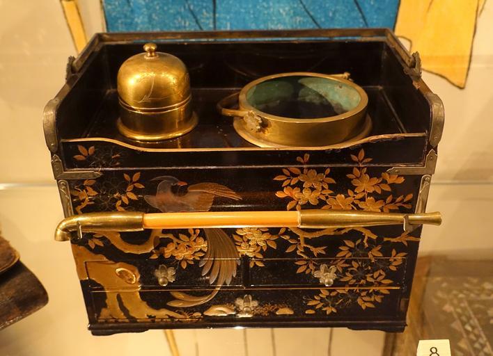 Keywords: Tobacco smoker's box, Japan, 19th century, black lacquer, silver and gold lacquer on wood, metal - Östasiatiska museet, Stockholm - DSC09180.JPG en Japanese lacquerware in the Östasiatiska museet Stockholm Sweden This item is old enough so that it is in the public domain Photography was permitted in the museum without restriction 2014-09-13 05 34 06 own Daderot cc-zero Lacquerware of Japan in Östasiatiska museet Uploaded with UploadWizard |