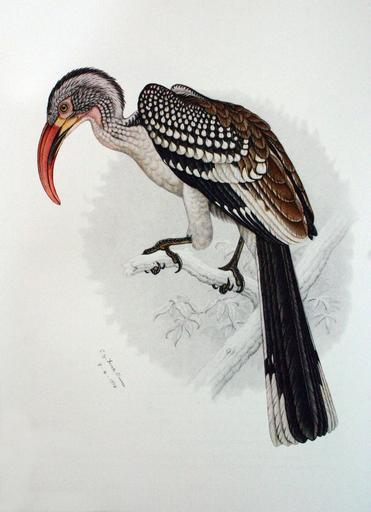 | Keywords: Tockus rufirostris by Finch-Davies 1918.jpg  ™‚ Tockus erythrorhynchus rufirostris <small> Sundevall 1850</small> 'n Volwasse Rooibekneushoringmannetjie Volwasse mannetjies is herkenbaar aan die lang snawel en swarterige ondersnawel Die ras soms beskou as 'n spesie is herkenbaar aan die bleek iris rosige oogring en aansienlik gestreepte nek An adult male Southern Red-billed Hornbill Adult males are recognizable by the long bill and swarthy lower mandible The race sometimes considered a species is distinguishable by the pale iris pink eye-ring and extensively streaked side of the neck The above specimen is likely from a farm near Windhoek Namibia and Finch-Davies had evidently been gaining experience of both the Southern and Damaraland species for some time <small>Tsumeb S W A 1 12 1916</small> <small>I found this species common at Tsumeb and Otavifontein and it probably occurs all through Northern Damaraland and Ovamboland; how far south it may be encountered in Damaraland I cannot say but I collected some specimens at Okanjande which appear to belong to this species; probaby about here it meets or merges into L e damarensis In habits the species exactly resembles the previous bird but I found it more universally scattered over the bush country and not as confined to river banks I have often seen it feeding on the ground digging up the soil and dead leaves with its bill evidently after insects At Otavifontein when General Botha's brigade was camped there in July 1915 it was exceedingly common and very tame flocks of them frequenting the horse lines old camping grounds and slaughter places presumably in search of insects This specimen was particularly heavily marked with grey about the head and neck; many specimens are much lighter but all considerably more marked than those from farther south L damarensis <ref> Cite book Kemp Alan The Bird Paintings of C G Finch-Davies Winchester Press Johannesburg 1984 0-620-07457-4 </ref></small> Transvaal Museum Pretoria 1918-04-09 Creator Claude Gibney Finch-Davies PD-old-auto-1923 1920 Reference reflist Tockus rufirostris Claude Gibney Finch-Davies |