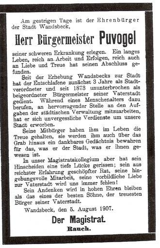 Keywords: Todesanzeige Puvogel.jpg de Todesanzeige für Friedrich Puvogel im Wandsbecker Boten vom 5 August 1907 Verfasst von Oberbürgermeister Eduard Rauch Scan aus Wandsbek informativ - Das Buch Heinevetter-Verlag Hamburg 1994 ISBN 3-929171-51-1 Eduard Rauch 1931 1907-08-05 PD-old Bezirk Wandsbek Puvogel-Todesanzeige Politicians of Hamburg Puvogel Friedrich Death notice Hamburg Puvogel |