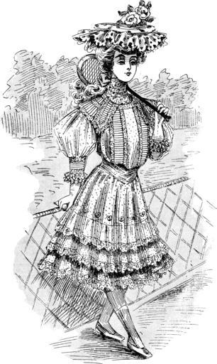 | Keywords: Toilette d'ete pour fillette de dix a douze ans.png fr Toilette d'ete pour fillette de dix a douze ans <br>Robe de plumetis blanc sur transparent de linon rosé Au corsage bandes de batiste blanche unie plissées et encadrées de petits entre-deux de valenciennes que surmontent d'étroits volants de même dentelle Jupe à trois volants froncés liserés d'entre-d eux de Valenciennes Charlotte en broderie anglaise ornée de deux rosés rosés et feuillage en Girls' toilet for ten to twelve years old <br>White satin dress transparent pink lawn The bodice plain white linen strips folded and framed by small-between Valenciennes surmounted by narrow lace ruffles as well Skirt ruffles to three edging of them-of Valenciennes Charlotte embroidered adorned with two pink roses and foliage L'Actualité page 298 anonymus 1906-03-13 PD-1923 PD-Art 1906 in sports Fashion in 1906 Tennis in art History of tennis Women's tennis March 1906 1906 paintings Tennis in France Drawings of girls Standing girls in art Playing girls Black and white drawings of dresses Flounces |