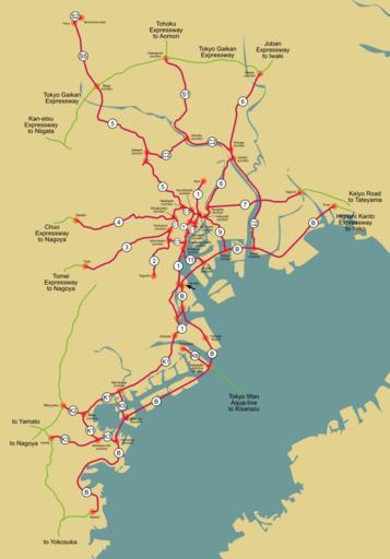 | Keywords: Tokyo Metropolitan Expressway map.svg See the talk page for a larger legible image 1024 px ;Other Versions <gallery>File Tokyo Metropolitan Expressway map-ja svg Modified Japanese version</gallery> Connections - colspan 5 環状線 belt highways - C1 高 都心環状線 Inner Circular 環状線部分 full belt - C2 高 中央環状線 Central Circular 西新宿JCT Nishi-Shinjuku Junction to 葛西JCT Kasai Junction - colspan 5 放射線 radial highways - 1 高 1号上野線 Ueno 江戸橋JCT Edobashi Junction to 入谷 Iriya - 1 高 1号羽田線 Haneda 崎橋JCT Hamazaki-bashi Junction to 羽田 Haneda - 2 高 2号目黒線 Meguro ノ橋JCT Ichinohashi Junction to 戸越 Togoshi - 3 高 3号渋谷線 Shibuya 谷町JCT Tanimachi Junction to 用 Yoga 名高 道路 Tomei Expressway - 4 高 4号新宿線 Shinjuku 三宅 JCT Miyakezaka Junction to 高井戸 Takaido 中央自動車道 Chuo Expressway - 5 高 5号池袋線 Ikebukuro 竹橋JCT Takebashi Junction to 美女 JCT Bijogi Junction - 6 高 6号向島線 Mukojima 江戸橋JCT Edobashi Junction to 切JCT Horikiri Junction - 6 高 6号三郷線 Misato 小菅JCT Kosuge Junction to 三郷JCT Misato Junction 常磐自動車道 Joban Expressway - 7 高 7号小 線 Komatsugawa 両国JCT Ryogoku Junction to 谷河内 Yagochi 京葉道路 Keiyo Road - 9 高 9号深 線 Fukagawa 箱崎JCT Hakozaki Junction to 辰巳JCT Tatsumi Junction - 10 高 10号晴海線 Harumi 晴海 Harumi to 雲JCT Shinonome Junction - 11 高 11号台場線 Daiba 浦JCT Shibaura Junction to 明JCT Ariake Junction - S1 高 口線 Kawaguchi 江北JCT Kohoku Junction to 口JCT Kawaguchi Junction 北自動車道 Tohoku Expressway - colspan 5 の他の路線 other routes - Y 高 八重洲線 Yaesu 神田橋JCT Kandabashi Junction to 汐留JCT Shiodome Junction plus a branch from 西 座JCT to 京橋JCT - B 高 湾岸線 Bayshore 崎浮島JCT Kawasaki-ukishima Junction to 高谷 Koya 関 自動車道 Higashi Kanto Expressway - - 高 湾岸分岐線 Bayshore branch 昭和島JCT to 海JCT - colspan 5 神奈 線 Kanagawa routes - K1 高 神奈 1号横羽線 Yokohane 羽田 Haneda to 石 町JCT Ishikawa-cho Junction - K2 高 神奈 2号三ツ沢線 Mitsusawa 金港JCT Kinko Junction to 三ツ沢 Mitsuzawa unknown expressway - K3 高 神奈 3号狩場線 Kariba 牧JCT Honmoku Junction to 狩場 Kariba unknown expressway - K5 高 神奈 5号大黒線 Daikoku 生麦JCT Namamugi Junction to 大黒JCT Daikoku Junction - K6 高 神奈 6号 崎線 Kawasaki 殿町 Tonomachi to 崎浮島JCT Kawasaki-ukishima Junction 京湾アクアライン Tokyo Wan Aqua-line - B 高 湾岸線 Bayshore 並 Namiki to 崎浮島JCT Kawasaki-ukishima Junction unknown expressway - colspan 5 埼玉線 Saitama routes - S2 高 埼玉新都心線 Saitama Shintoshin 与野 Yono to 新都心 Shintoshin-nishi - S5 高 埼玉大宮線 Omiya 美女 JCT Bijogi Junction to 与野 Yono An asterisk is used for English names listed on the official website Route or Line sometimes appears after There are also connections to the 京外環自動車道 Tokyo Gaikan Expressway/Tokyo Outer Ring Road and thus to the 関越自動車道 Kan-etsu Expressway Main sources are http //www shutoko jp/drivers/route/rosen/index html and http //motorways-exitlists com/asia/j/japan htm Traced on Google Maps mainly aerial photos The aerial photo in the background is from Landsat and is thus public domain specifically http //earthobservatory nasa gov/Newsroom/NewImages/images php3 img_id 10786 this image SVG maps in English Metropolitan Expressway Tokyo Maps of expressways in Japan |
