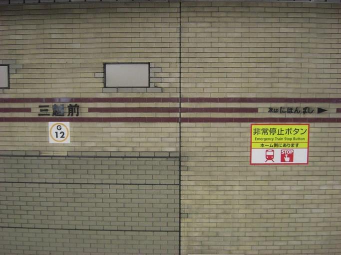 | Keywords: TokyoMetro-G12-Mitsukoshimae-station-sign.jpg 三越前駅 座線駅名標 Station sign of Mitsukoshimae Station 人撮影 2007-07-26 E231 original upload log wikitable date/time username resolution size edit summary ---- 13 05 26 July 2007 User 南 晃佑 3 648×2 736 4 6 MB <nowiki> 三越前駅 座線駅名標 人撮影 2007/7/26 E231 自身の 品かつ 全ての権利を放棄 パブリック・ドメイン Own work all rights released other_versions</nowiki> original upload log wikitable date/time username resolution size edit summary ---- 2008-08-09T02 34 51Z User BetacommandBot 3648×2736 4 6Gb <nowiki>move approved by User Mike lifeguard This image was moved from Image CIMG0616 JPG ファイルの概要 三越前駅 座線駅名標 人撮影 2007/7/26 E231 自身の�</nowiki> Mitsukoshimae Station |